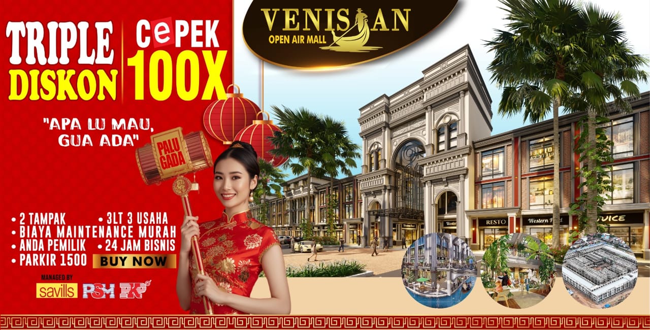 Kelima, fasilitas yang unik. Venisian Mall (Open Air) adalah satu-satunya Mall di Indonesia yang memiliki fasilitas Gondola diatas kanal dan fasilitas Fresh Air dari ratusan pohon yang ditanam di kawasan Venisian Mall yang mengusung tema Rimba Forest.